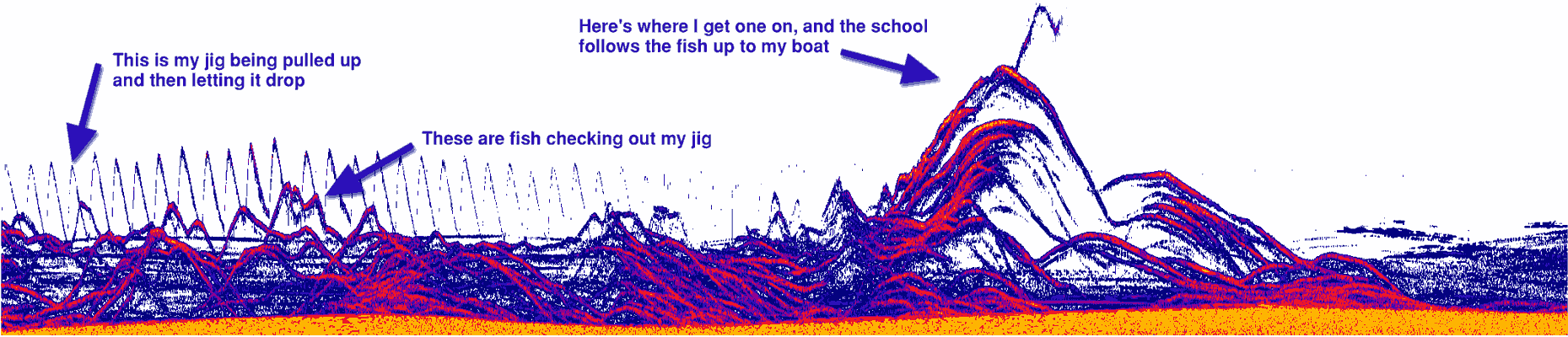 Jigging a spoon in the trees and catching a striper. Scroll horizontally to see the rest of the image.
