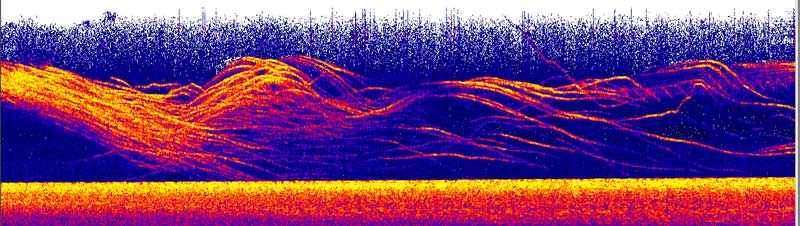 Decent school of August stripers. This is the tail-end of the school and we jigged up multiple fish out of this school.