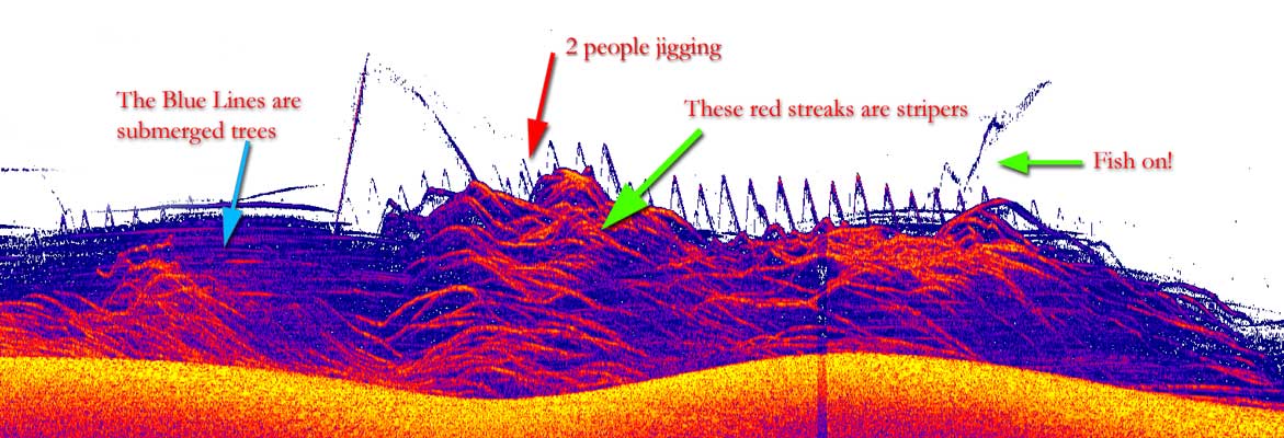 Jiggin' in the trees. Although we lost 4-5 spoons this day, we caught a ton of fish. These fish were not active when we found them, but after jiggin on them for a couple of minutes, they turned on.